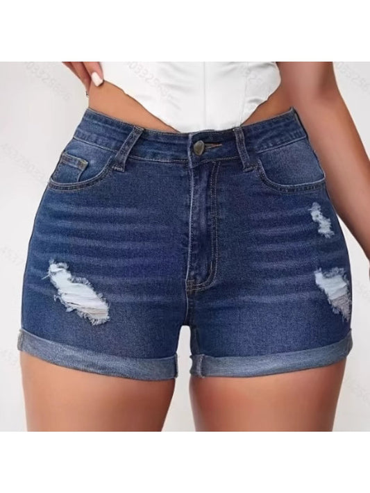 2026 New Women's High-Waisted Ripped Denim Shorts - Stretchy Slim-Fit Hot Pants with Built-in Zipper & Solid Color Tear Details